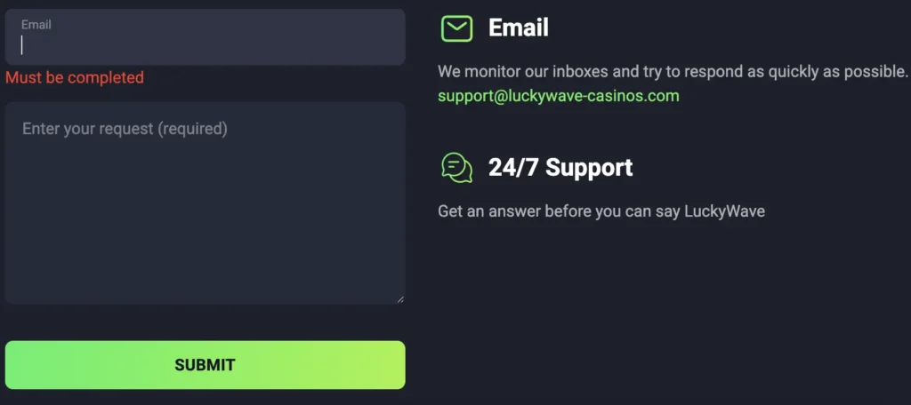 You can reach us anytime via live chat on our website or by email. For a quick response, simply click the chat icon in the bottom-right corner of your Lucky Wave screen. All players can also contact us through the Support page. Scroll to the bottom of any page, open Help & Contact and find the support link. Then, you can write to us in a live chat if you have a quickly-solvable issue or go to the email and describe your problem there. Our customer care team responds within minutes and is known for being both friendly and efficient.