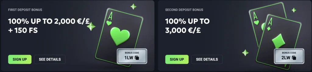 Casino Luckywave offers its players a generous welcome bonus for 4 deposits. Just create an account and after your initial top-ups, you’ll be given 15,000 GBP and 300 free spins. This bonus works together with promo codes, which you should enter while depositing the funds into your account.